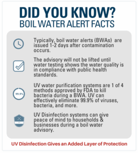 Major contaminants are rarely life threatening, but they make people, especially younger children, elderly people, or those with compromised immune systems very sick. Bacteria, Cryptosporidum, Giardia, E. Coli, and viruses are the most common contaminants during a boil water advisory. These organisms primarily affect the gastrointestinal system, causing diarrhea, abdominal cramps, nausea, and vomiting with or without a fever. Boiling or disinfecting will neutralize the bacteria in water, but installing a UV System is the safest way to ensure that you never have to worry about contaminants in you water, not even during a BWA.